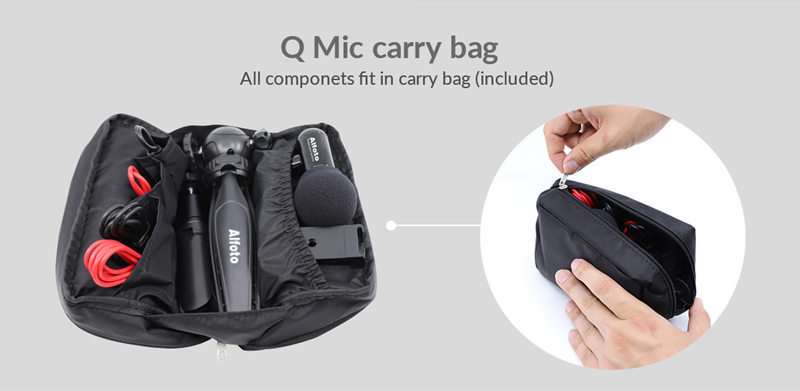 Component - Q Mic microphone / Windscreen / Phone holder / Mic case / Pouch / Black cable(28cm) / Black cable(1.5M) / Red cable(28cm) / Red cable(1.5M) / Ballhead tripod / Mini tripod / 1-Year Limited WARRANTY.